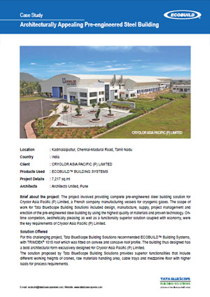 The project involved providing complete pre-engineered steel building solution for Cryolor Asia Pacific (P) Limited, a French company manufacturing vessels for cryogenic gases.