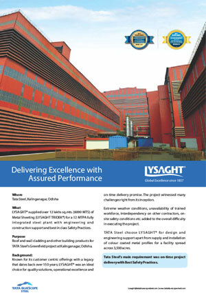 Roof and wall cladding and other building products for TATA Steel’s Greenfield project at Kalinganagar, Odisha.
